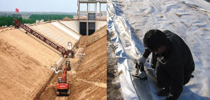 土工膜在搬運(yùn)過(guò)程防止尖銳物體損傷膜;膜的裁剪寬度是根據(jù)坡面長(zhǎng)度加上溝槽深寬度和上坡面水平面的壓實(shí)寬度,根據(jù)蓄水深度用勾股定理計(jì)算坡面長(zhǎng)度,一般溝槽埋壓40cm,水平面壓30cm即可,三者相加即裁剪寬度,現(xiàn)場(chǎng)裁剪施工時(shí)場(chǎng)地要平整,同時(shí)避免有風(fēng)雨天氣,由于池塘周長(zhǎng)的關(guān)系,一般都需進(jìn)行拼接,拼接方法有焊接、縫接、粘接三種,焊接需要有專業(yè)焊接機(jī)和專業(yè)人員施工,粘接需要特殊膠粘劑,兩者在現(xiàn)場(chǎng)施工較為繁瑣,實(shí)際操作基本采用縫接方法,用聚乙烯線機(jī)器或手工縫接即可,縫接采取相嵌式。