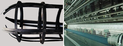 鋼塑復合土工格柵以高強鋼絲(或其他纖維),經特殊處理,與聚乙烯(PE),并添加其他助劑,通過擠出使之成為復合型高強抗拉條帶,且表面有粗糙壓紋,則為高強度加筋土工帶。由此單帶,經縱、橫按一定間距編制或夾合排列,采用特殊強化粘接的熔焊技術焊接其交接點而成型,則為加筋土工格柵。