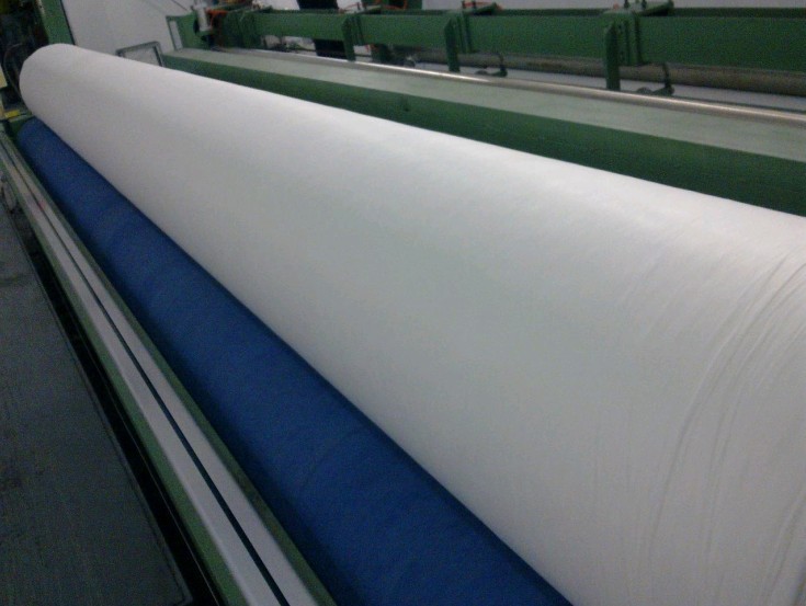 土工布是目前應用最廣泛的非織造土工布之一。纖維經過開松混合、梳理(或氣流)成網、鋪網、牽伸及針刺固結最后形成成品,針刺形成的纏結強度足以滿足鋪放時的抗張應力,不會造成撕破、頂破。由于其厚度較大、結構蓬松,且纖維通道呈三維結構,過濾效率高,排水性能好。其滲透系數達10-1~10-2,與沙粒濾料的滲透系數相當,但鋪起來更方便,價格也不貴,因此用作反濾和排水最為合適。還具有一定增強和隔離功能,也可以和其它土工合成材料復合,具防護等多種功能。由于非織造土工布具反濾和排水的特點,因此在水力學性能方面要特別予以重視,一是有效孔徑;二是滲透系數。要利用非織造布多孔的性質,使孔隙分布有利于截留細小顆粒泥土又不致于淤堵,這必須結合工程的具體要求,予以滿足。